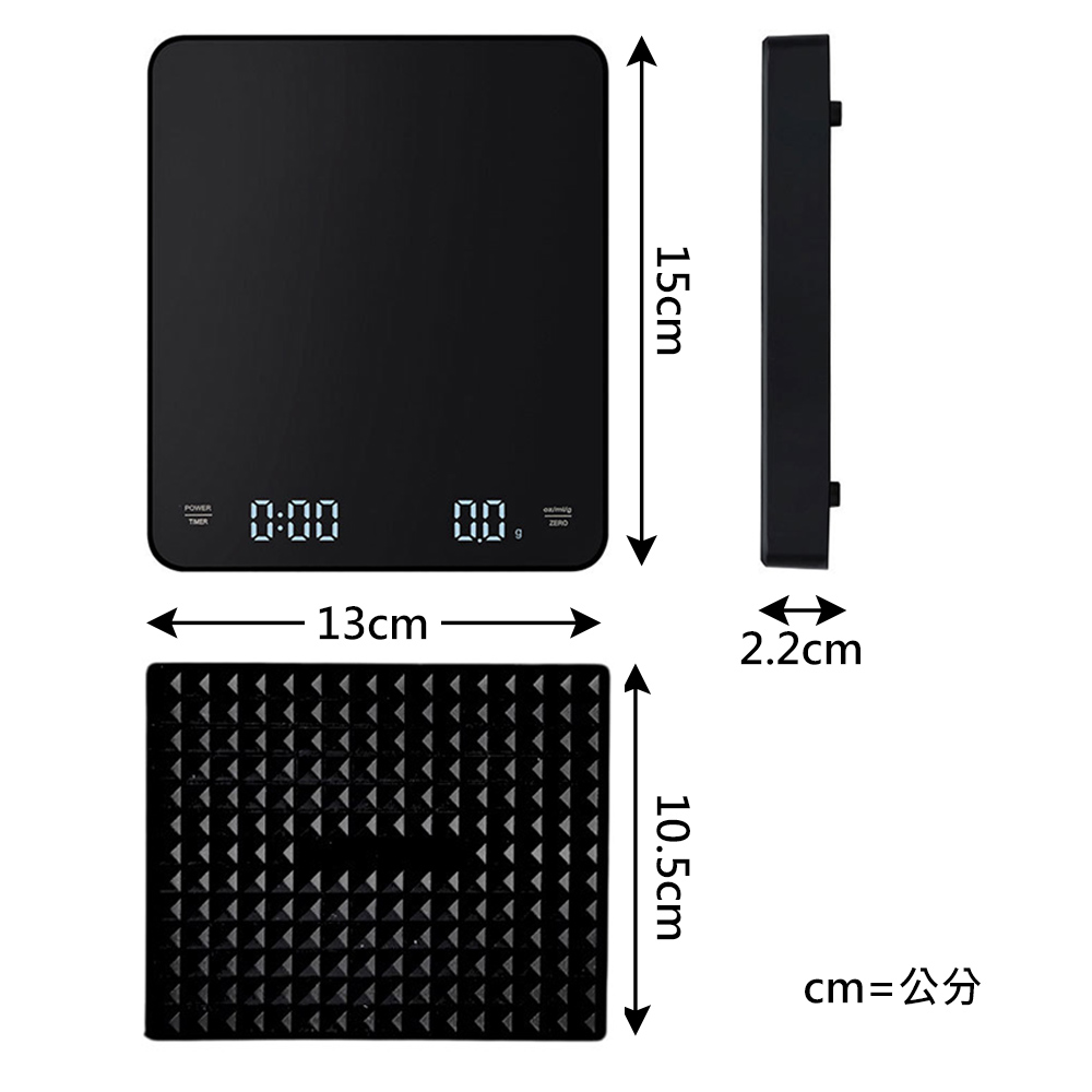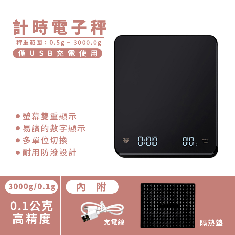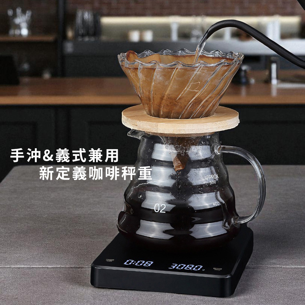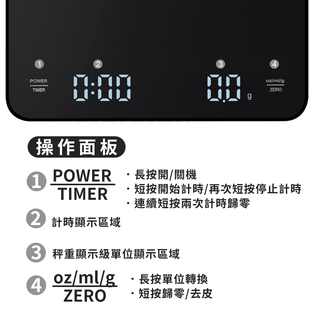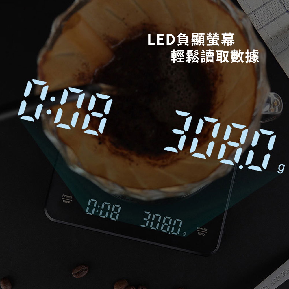 1、雙重顯示:同時顯示重量與計時,讓沖煮流程一目了然。