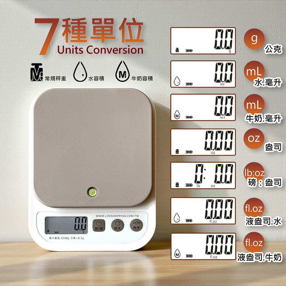 單位:克(g)、毫升(水)(ml)、毫升(牛奶)(ml)、盎司(oz)、磅:盎司(lb:oz)、 液盎司(水) (fl oz)、液盎司(牛奶) (fl oz)